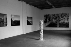 Von der Decke des Clusterraums bis zum Boden hängt Roy Voss einen großen, kulissenartigen Druck. In der darauf abgebildeten Landschaft scheinen in situ großformatige Buchstaben platziert worden zu sein, die an den Hollywood Schriftzug oder riesige Billboards erinnert. Die doppeldeutigen Worte in seinen Werken scheinen sowohl mit der meist ruralen Landschaft, als auch mit dem Betrachter außerhalb dieses Bildraums zu kommunizieren. (Alle Werke von Roy Voss: Courtesy Matt’s Gallery, London).